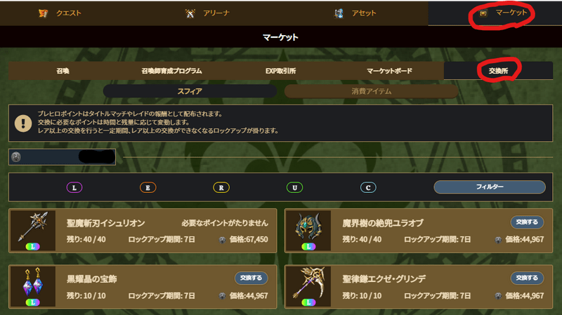 また、R以上のスフィアに関しては続けてR以上のスフィアを交換するまでロックアップ期間が課される。現在交換所に並んでいるスフィアを確認する限りでは、