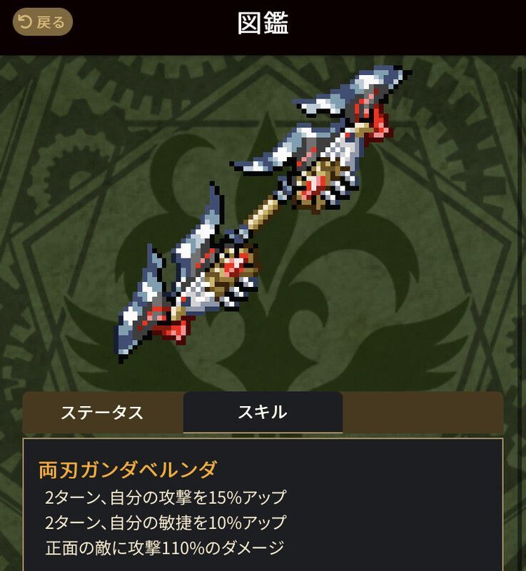 - 両刃ガンダベルンダ:2ターン、自分の攻撃を15%アップ、攻撃110%のダメージ