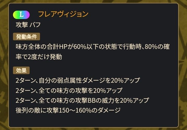 挑発スキルのボルトイグニッション、強化&列攻撃スキルのフレアヴィジョン、状態異常攻撃のヴェンジェンス、全体攻撃スキルのシャイニングセリカ、魔攻列攻撃スキルの∑レイヤー…12個中の5個のBBが少なくとも一線級だと考えています。