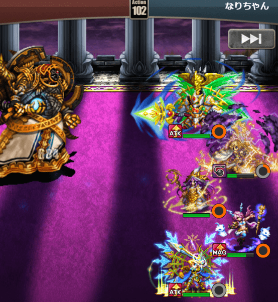 ワタシの編成では前列上段のメルキオが覇神斧ゲルダネイトを持っているため、前列のヴァン・ナーダにだけ重圧がかかってしまっています(このバトルではたまたまそのタイミングでアトロBBを撃っていなかっただけ)