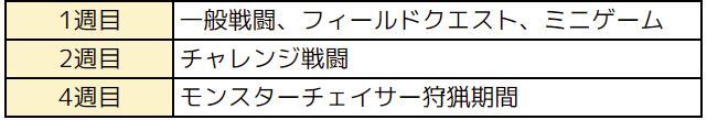 モンスターチェイサーは3週間の準備期間、1週間の狩猟期間で構成されるバトルイベントです。詳細は以下のページです。