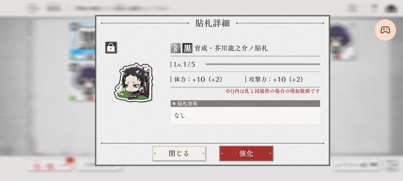 | イベント 概要 | イベント期間中、「属性ヰ回廊・黒」の探索完了で ・イベントpt「芥川龍之介龍之介ポイント」 ・イベント貼札 ・獲得量が1.5倍に増加した「札強化素材・小」 が追加で獲得できる。 |