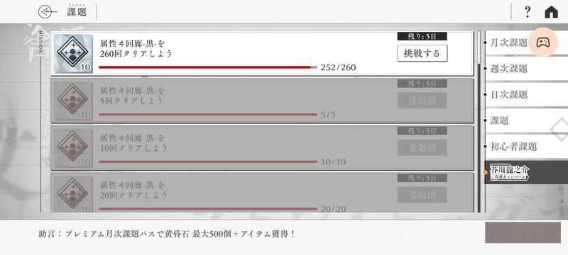 1013時間まえ ID:si5tykc6課題「属性ヰ回廊・黒を〇〇回クリア」について、110回以降は+10回で課題が追加されました。