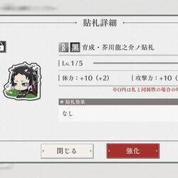 貼札はコレクション枠と考えていますが、交換するなら、弁当箱の貼札はイベントドロップ対象のため、R芥川の貼札(1500pt)の方が良いと思います。SR貼札(6000pt)は任意でどうぞ(一応、貼札ガチャからも排出はされます)。