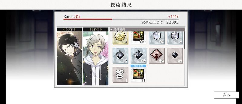 | イベント 概要 | イベント期間中、「属性ヰ回廊・黒」の探索完了で ・イベントpt「芥川龍之介龍之介ポイント」 ・イベント貼札 ・獲得量が1.5倍に増加した「札強化素材・小」 が追加で獲得できる。 |