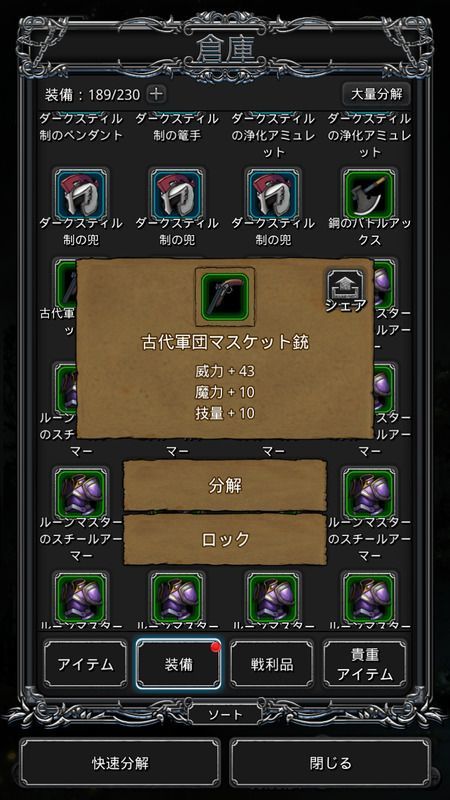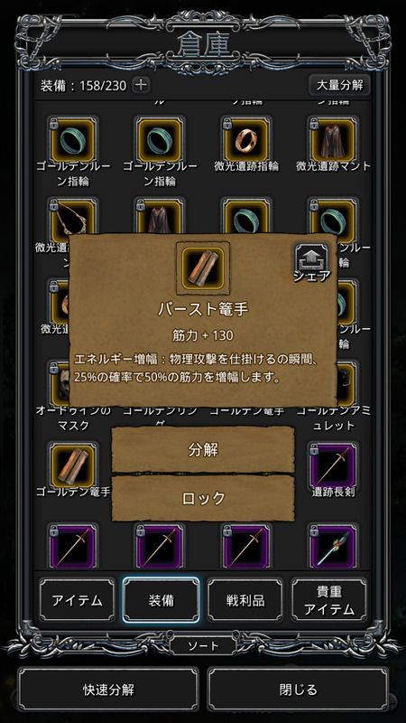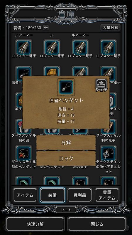 これを集めて神殿にもって行けば対象モンスターとバトルが行え、勝てば装備品がランダムでもらえる。