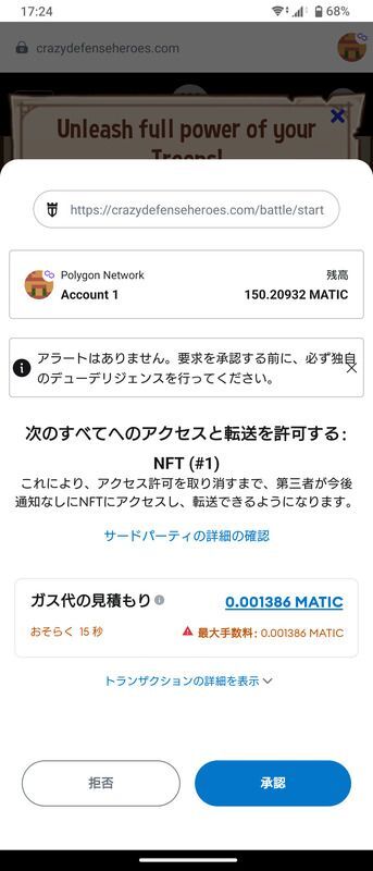 すると…いつもの「星の宝箱 Play To Earn」でのガス代支払いとは違う画面が出てきました。「転送を許可する:NFT」とありますので、どうやらここで承認する事でNFTバトルカードを「Co-op Battle」用に送り出すようです。