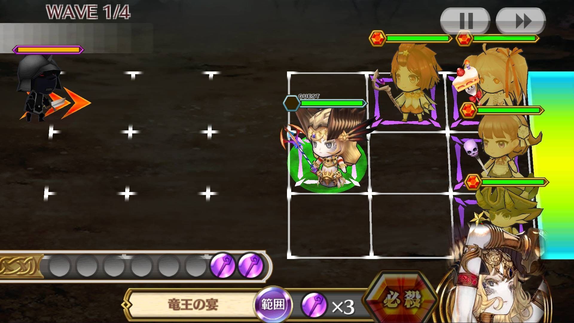 | 竜王の宴 | 3 | 【変身】自身の肉体を竜化させる。一定時間(60秒)攻撃力(40%)、移動速度、攻撃間隔が上がり、通常攻撃が敵を貫通する。変身後、一定時間(53秒)、一定間隔(6.5秒)ごとにランダムで(最大9回)敵1体に中ダメージ(3.4倍)を与える。 |