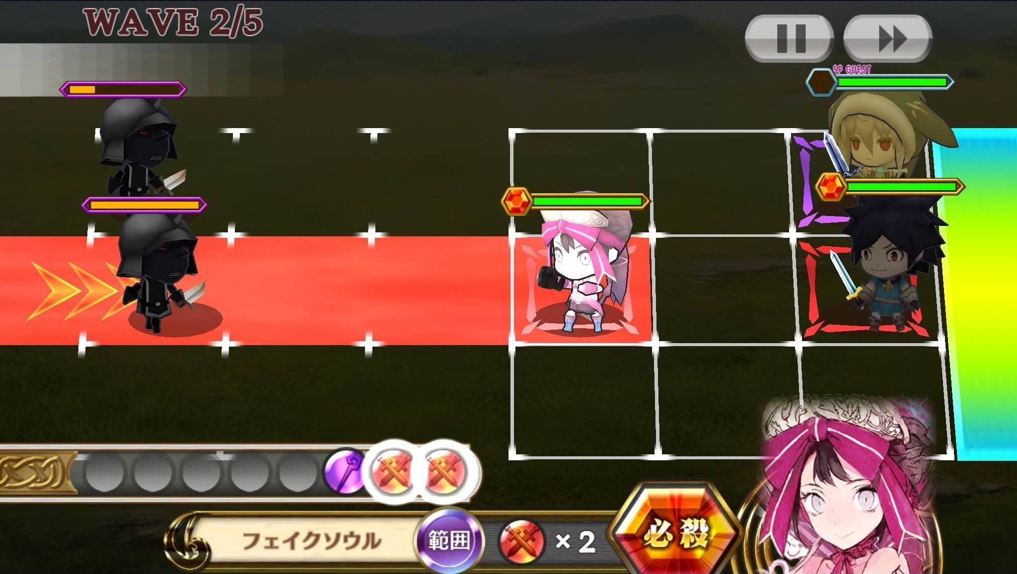 | フェイクソウル | 2 | 【溜め】(一定時間後発動、溜め中は行動不能)直線範囲上にいる全ての敵に中ダメージ(?倍)を与え弾き飛ばす。 |