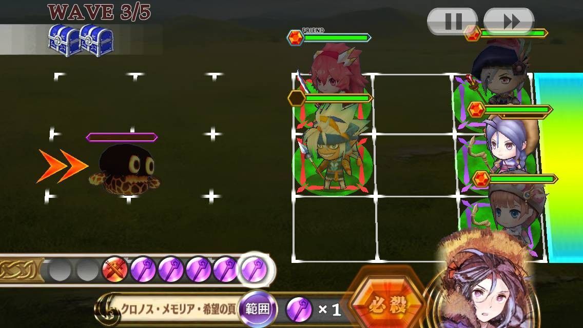 | クロノス・メモリア・希望の頁 | 1 | 自陣最後列にいる時、味方全体の攻撃力(25%)と移動速度と防御力(5%)を一定時間(12秒)上げる。 |