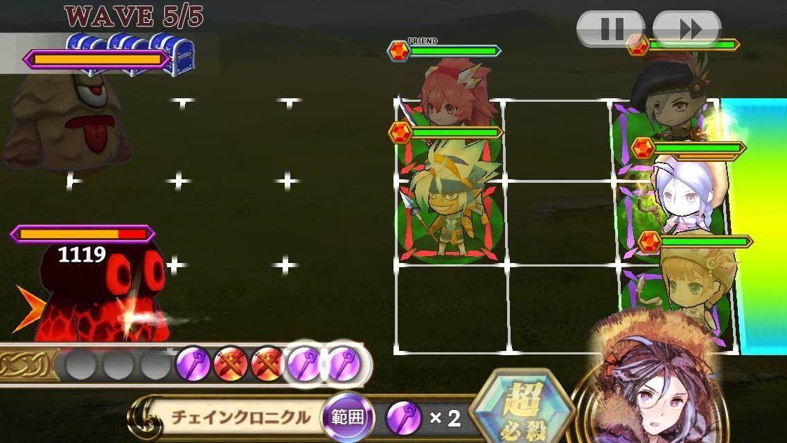 | チェインクロニクル | 2 | 【超必殺/連撃】チェインクロニクルの力で味方全体を(ATKの100%)回復した後、広範囲内の敵全てに物理属性の大ダメージ(13倍)を与える。 |