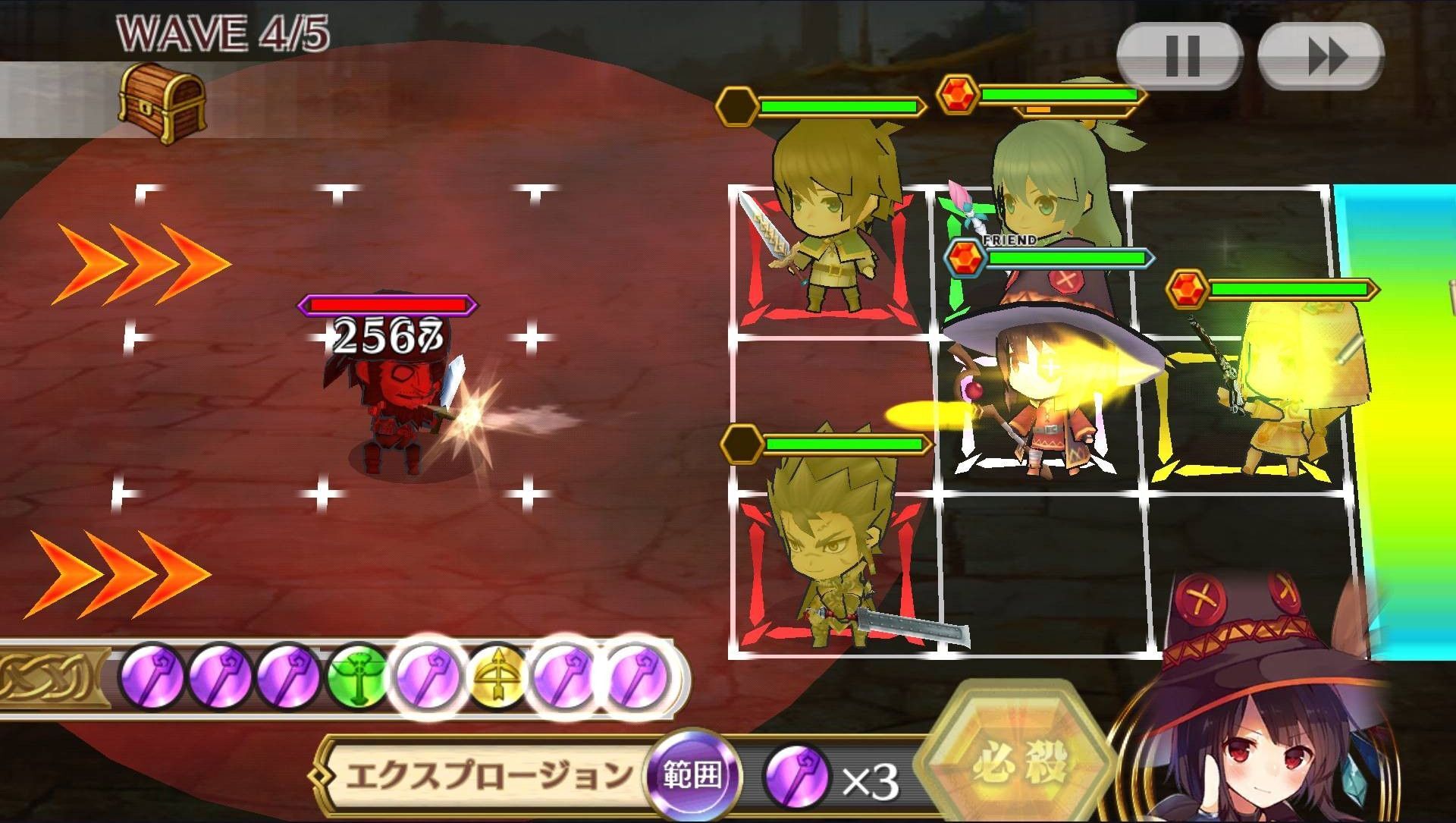 | 【魔力供給】エクスプロージョン | 3 | 【溜め】(タッチ/スワイプで発動、溜め中は行動不能)直線範囲上にいる敵1体とその周囲に炎属性の大ダメージ(14倍)を与え、自身も最大HPの80%のダメージを受ける。また、溜め時間に応じて必殺技の威力(最大20倍)が上がり、最大まで溜めるとダウン効果を追加する。 |