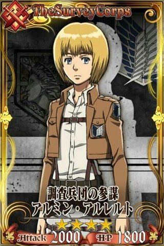 | 調査兵団の参謀アルミン・アルレルト | ★★★★SR | TheSurveyCorps | 戦士 | 旅人 | 750 | 70 | 15 | 諌山創/「進撃の巨人」製作委員会 | 井上麻里奈 |