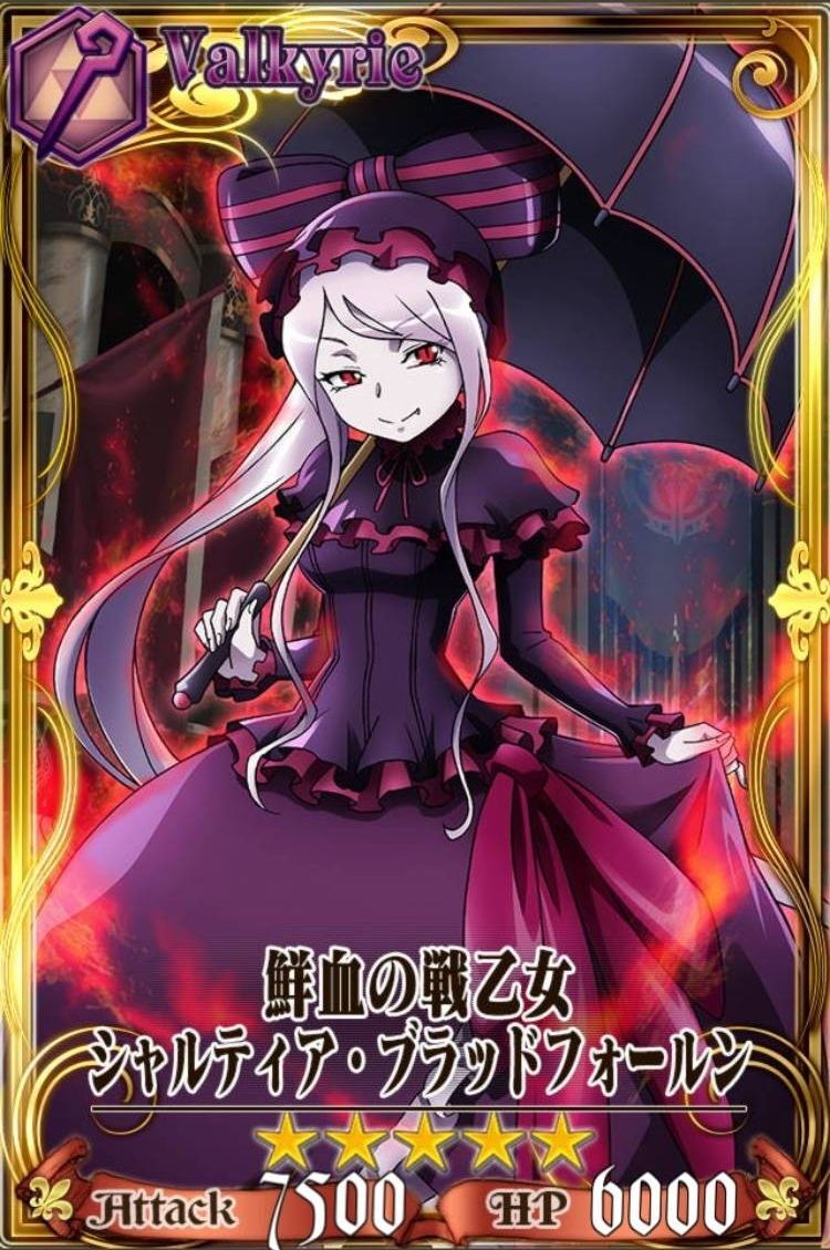 | 鮮血の戦乙女シャルティア・ブラッドフォールン | ★★★★★SSR | Valkyrie | 魔法使い | 旅人 | 1000 | 80 | 20 | オーバーロード2製作委員会 | 上坂すみれ |