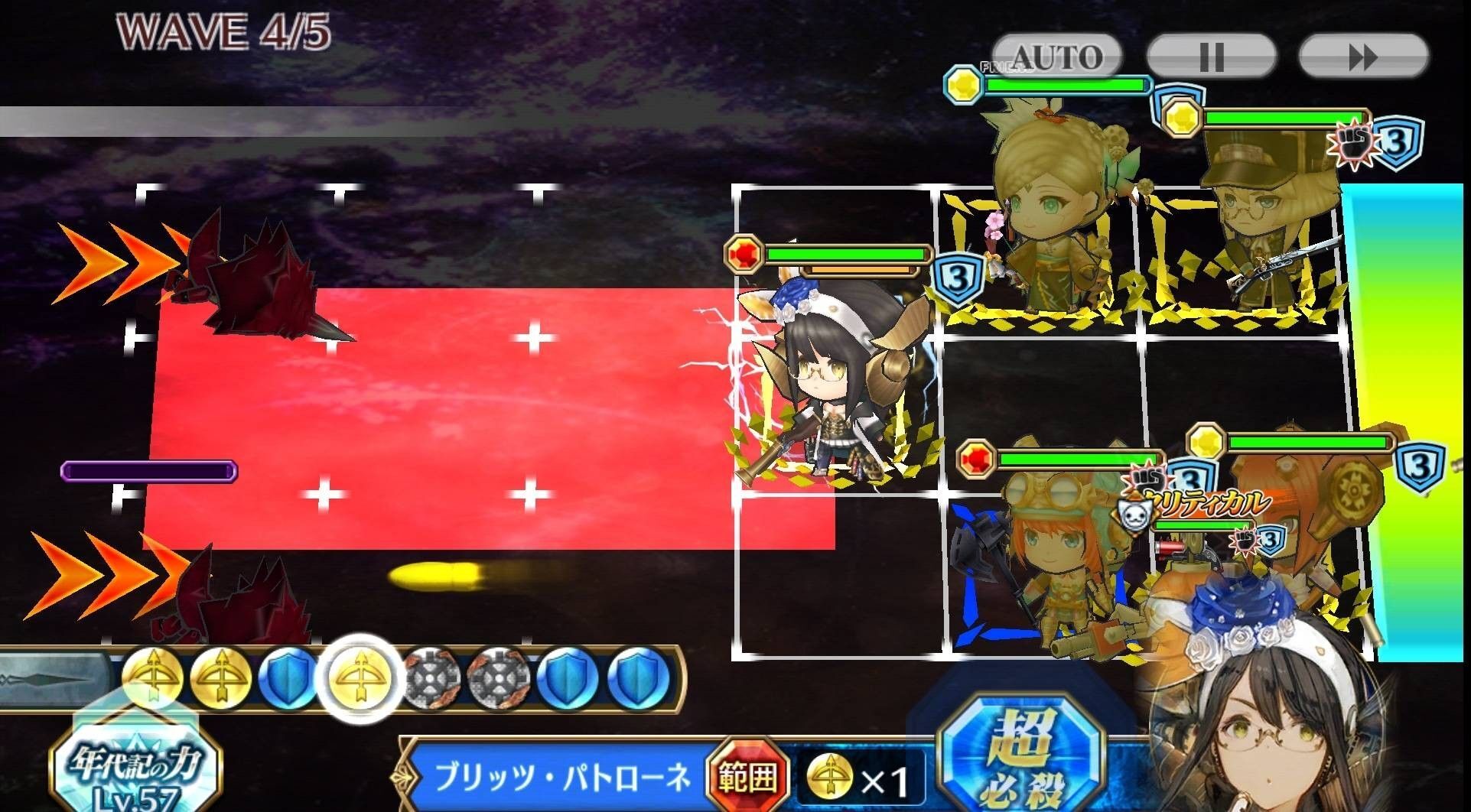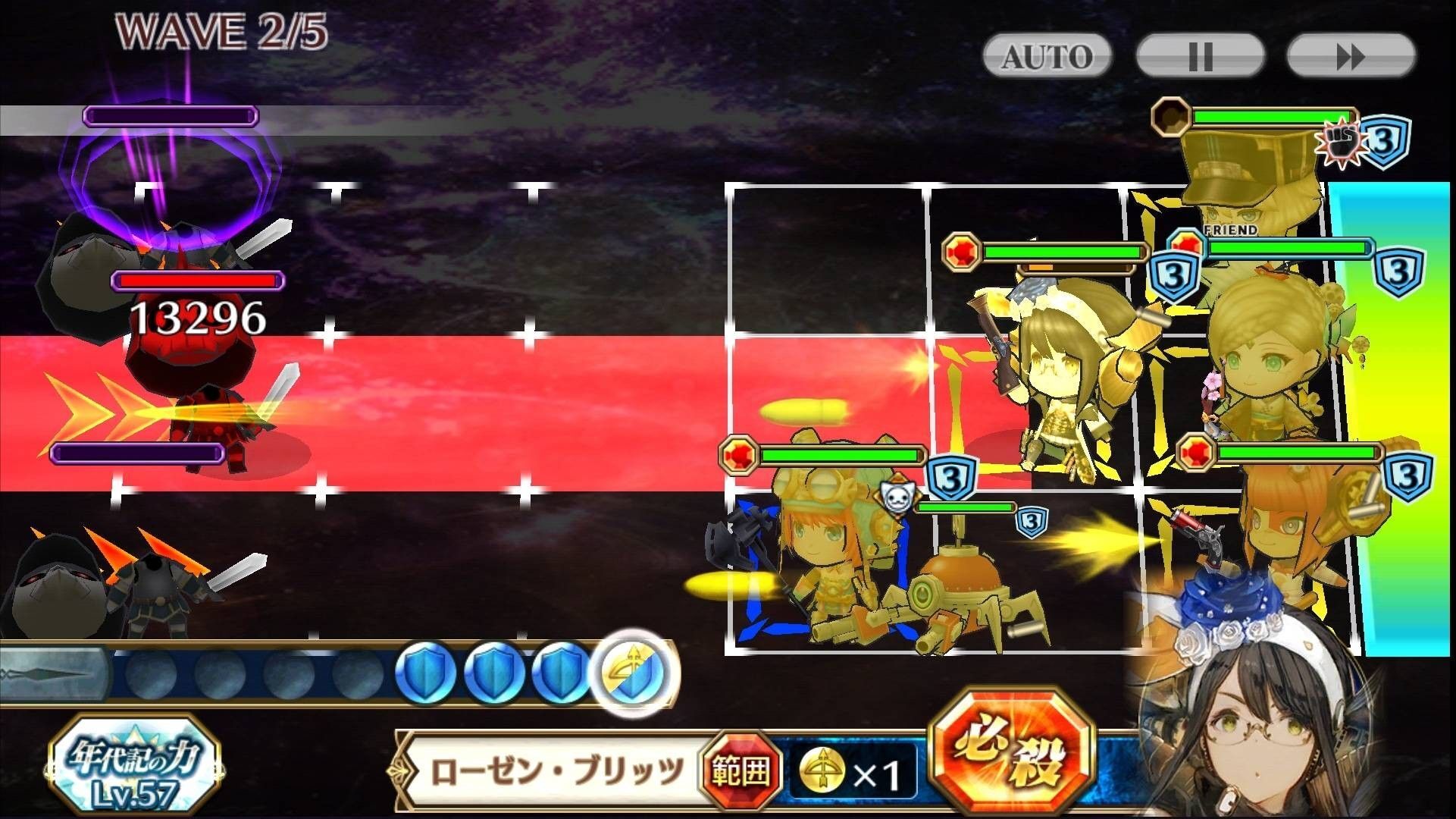 | ローゼン・ブリッツ | 1 | 直線範囲上の全ての敵に中ダメージ(6倍)を与え、弾き飛ばす。同時に攻撃した敵の防御力(15%)が一定時間(20秒)下がる。スクラップを2つ生成する。 |