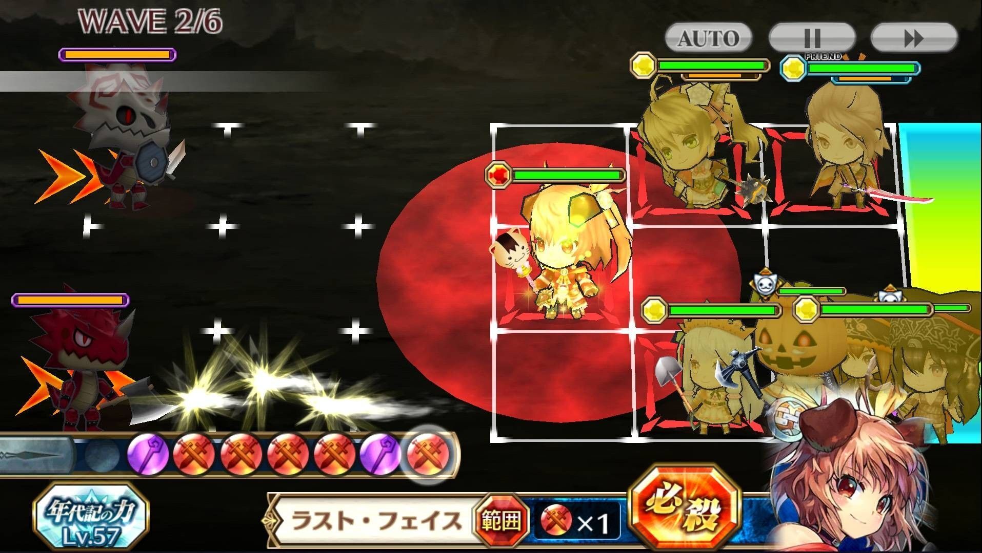 | ラスト・フェイス | 1 | 【連撃】自身中心範囲内の全ての敵に小ダメージ(3倍)を与え、ダウンにする。その後、自身中心範囲内の全ての敵に中ダメージ(6倍)を与え、弾き飛ばす。 |