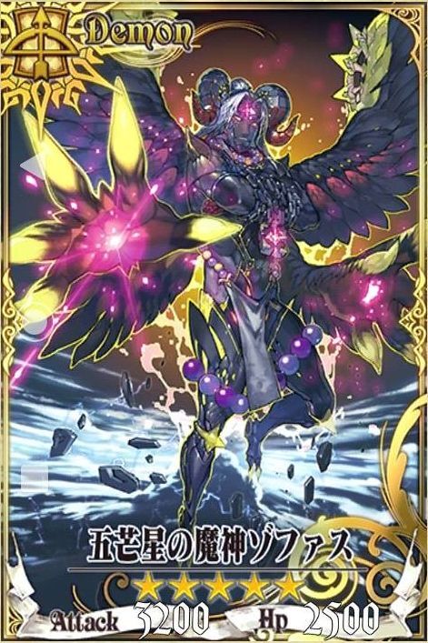 | 五芒星の魔神ゾファス | ★★★★★SSR | Demon | 弓使い | 魔神 | 18 | なまにくATK(ニトロプラス) | 速水奨 |