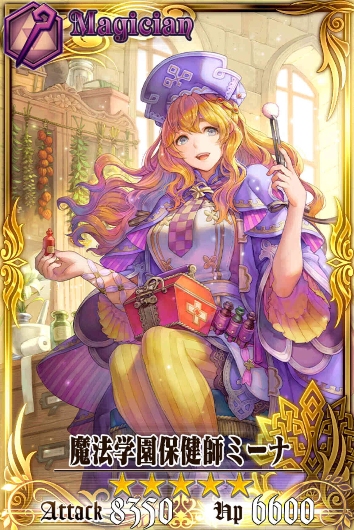 | PROFILE | 友達や仲間のために、少しでも力になれたら……と、魔法薬の研究を進めながら学園の保健室で保健師をしているミーナ。かつての自分のように、悩みがちな少年少女の心に寄り添っている。 |