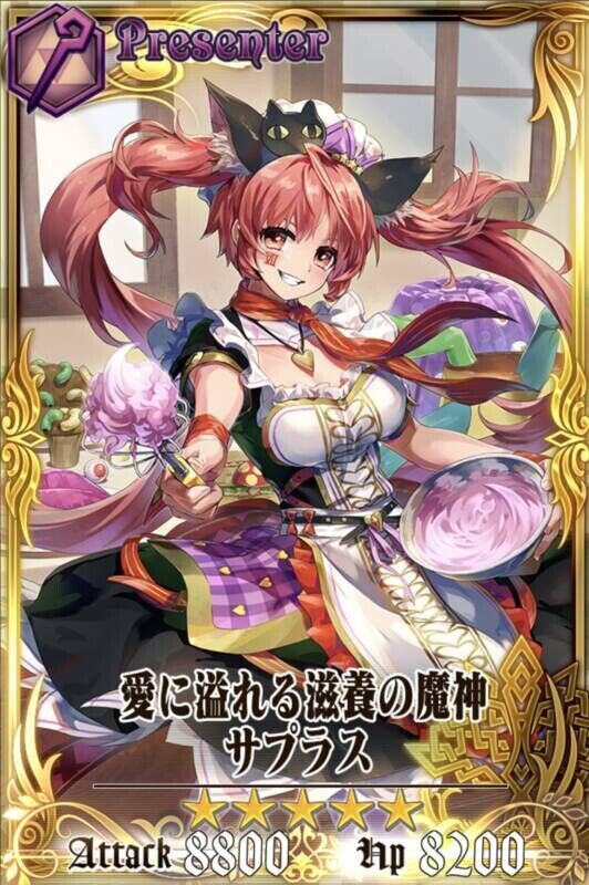 | 愛に溢れる滋養の魔神サプラス | ★★★★★SSR | Presenter | 魔法使い | 魔神 | 20 | 竜徹 | 野中藍 |
