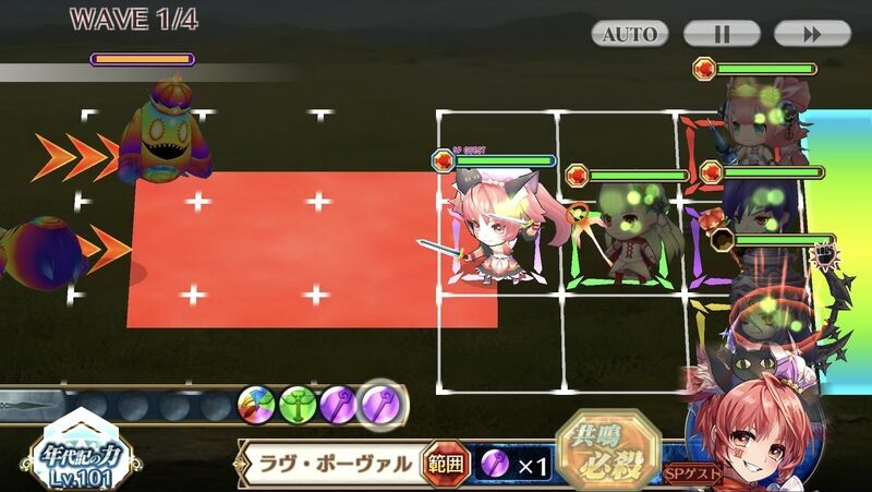 | ラヴ・ポーヴァル | 1 | 【連撃】前方範囲内の全ての敵に中ダメージを与え、弾き飛ばし、毒/ダウンにする。同時に攻撃した敵の攻撃力と防御力が一定時間下がる。その後、味方全体の攻撃力と防御力が一定時間上がる。 |
