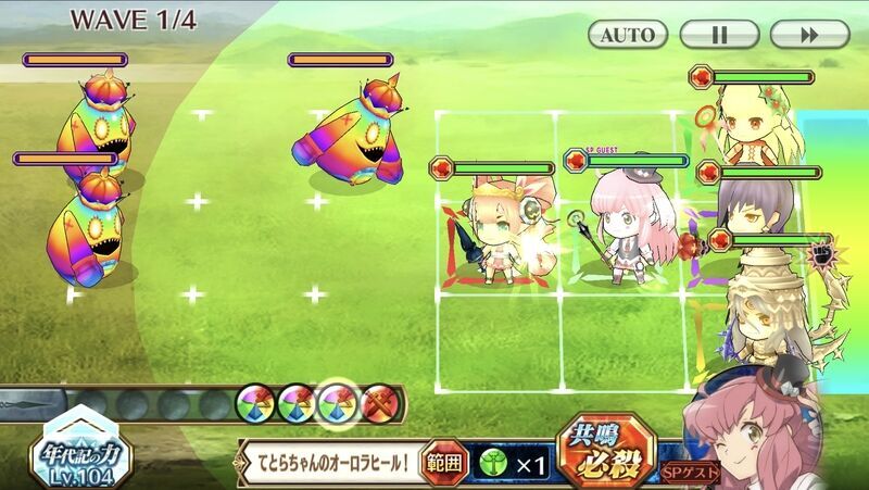 | てとらちゃんのオーロラヒール! | 1 | 味方全体のHPを上限を(?%)超えて小回復(?%)する。さらに味方全体の攻撃力(?%)と防御力(?%)を一定時間(?秒)上げる。 |