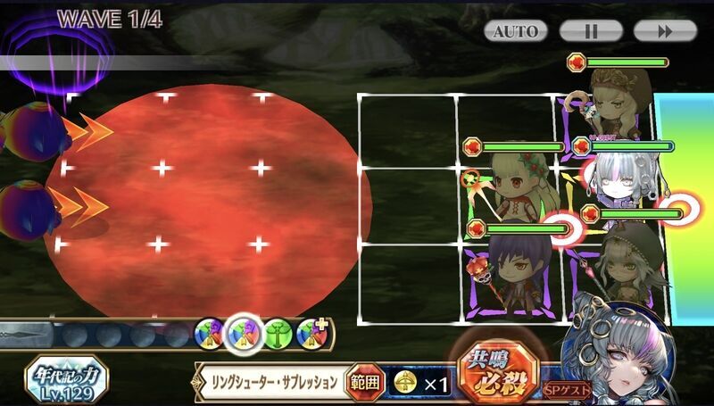 開幕自動スキル発動 310秒間約3.5秒毎に0.5倍×4。30秒間攻撃25%、防御25%ダウン