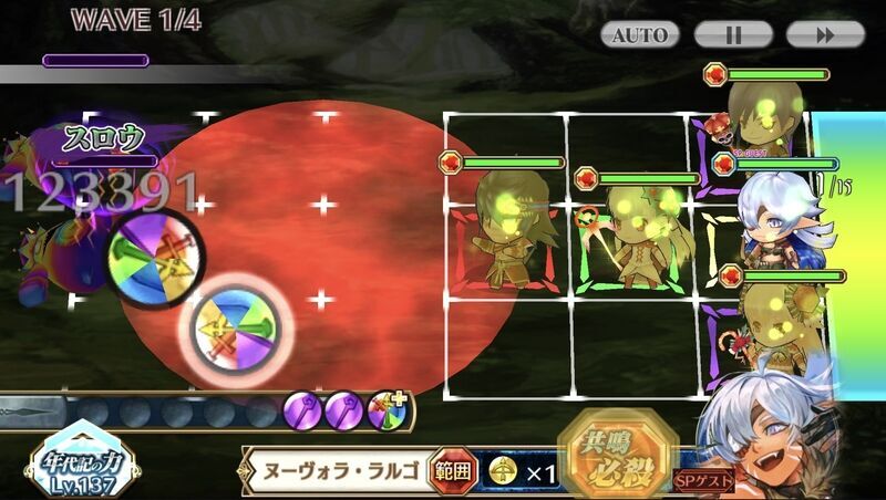 | 【共鳴必殺/連撃/付加】前方範囲内の全ての敵に中ダメージ(8倍)を与え、ダウンにする。その後、自身に敵に近づくまで姿が消え、消えている間は必殺技以外の遠距離通常攻撃が効かなくなる効果を一定時間(28秒)付与する。さらに一定時間(30秒)、味方全体の通常攻撃にスロウにする追撃(35%)を付加する。また、味方全体の攻撃力(40%)と防御力(ATK2%)が一定時間(30秒)上がる。 | |||