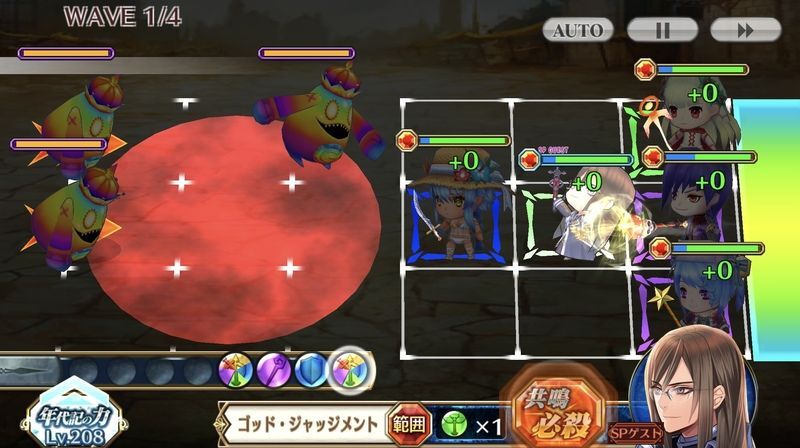 | 【連撃】前方範囲内の全ての敵に中ダメージ(?倍)を与え、弾き飛ばし、スロウにする。その後、味方全体のHPを上限を(?%)超えて(?%)中回復する。さらに味方全体の攻撃力(?%)と防御力(?%)と移動速度を一定時間(?秒)上げる。 | |||