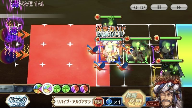 | 【連撃】前方範囲内の全ての敵に3回ダメージ(?倍)を与え、弾き飛ばし、毒/スロウにする。マナが多いほど必殺技の威力が(?%)上がる。その後、味方全体の攻撃力(?%)と防御力(?%)と移動速度が一定時間(?秒)上がる。さらに、自身に最も近い味方2人に、戦闘不能になった際に1回耐え、HPが回復し、一定時間ダメージを受けなくなる効果を与える。 | |||