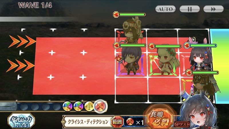 | ◆戦場にいる味方の攻撃力(?%)と防御力(?%)と移動速度が上がる。<ケ者の大陸>所属の味方の場合、さらにクリティカル発生率とクリティカル威力(?%)が上がる。 ◆敵陣にいる味方の攻撃力(?%)と防御力(?%)が上がり、HPが徐々に(?%)回復する。自陣にいる味方の攻撃力(?%)と防御力(?%)とクリティカル威力(?%)が上がる。 ◆自身を含む味方が必殺技を発動するたび、味方全体の攻撃力(?%)と防御力(?%)とクリティカル威力(?%)が一定時間(?秒)上がる。自身が必殺技を発動した場合、さらに暗闇/スロウ/ダウン/封印を回復する。 英雄になりたいなら…あたしが、強くなるしかないんだっ! | |