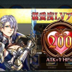 | ◆戦場に自身を含む騎士の味方が多いほど味方全体の攻撃力(?%)と防御力(?%)と移動速度が上がる。この効果は5人まで上昇する。 ◆自身を含む味方が必殺技を発動するたび、味方全体の攻撃力(?%)と防御力(?%)とクリティカル威力(?%)が一定時間(?秒)上がる。 ◆戦闘開始時とボスWAVE開始時、一定時間(?秒)、味方全体の通常攻撃に暗闇/スロウにする追撃を付加し、同時に自身の攻撃力(?%)とクリティカル威力(?%)が一定時間(?秒)上がる必殺技が発動する。 閣下がいれば、ただそれだけで……。 | |
