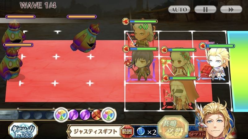 | ◆戦闘時、攻撃力(?%)が上がる。WAVEが進むたび、効果が(?%)上がる。 ◆WAVEが進むたび、味方全体のHPが上限を(?%)超えて(?%)回復し、全状態異常を回復する。 | |||