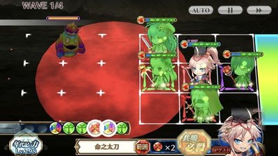 | 【連撃/付加】前方範囲内の全ての敵に2回ダメージ(?倍)を与え、弾き飛ばし、ダウンにする。その後、一定時間(?秒)、味方全体の通常攻撃に追撃(?%)を付加する。さらに味方全体の攻撃力(?%)と防御力(?%)と移動速度が一定時間(?秒)上がる。 | |||