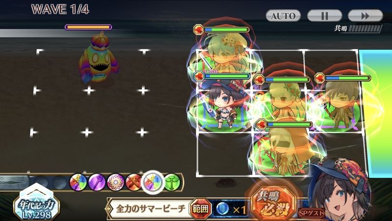 | ◆戦場にいる味方の攻撃力(?%)と防御力(?%)と移動速度が上がる。自身を含む味方が敵を倒すたび、一定時間(?秒)効果が(?%)上がり、さらにクリティカル発生率とクリティカル威力(?%)が一定時間(?秒)上がる。 ◆戦闘開始時とボスWAVE開始時、一定時間(?秒)、味方全体が無敵になり、地形を砂浜に一定時間(?秒)変更する必殺技が発動する。また地形が砂浜/船上/海中の時、味方全体の攻撃力(?%)とクリティカル発生率とクリティカル威力(?%)が上がる。自身の場合、さらに攻撃間隔が早くなる。 今日もみんなで一緒に、なにしよっか? | |