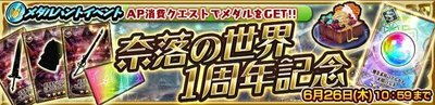 奈落の世界1周年記念のメダルハントイベントの開催期間中、APを消費するクエストをクリアすることでイベント専用の「奈落の世界1周年記念メダル」が手に入ります!