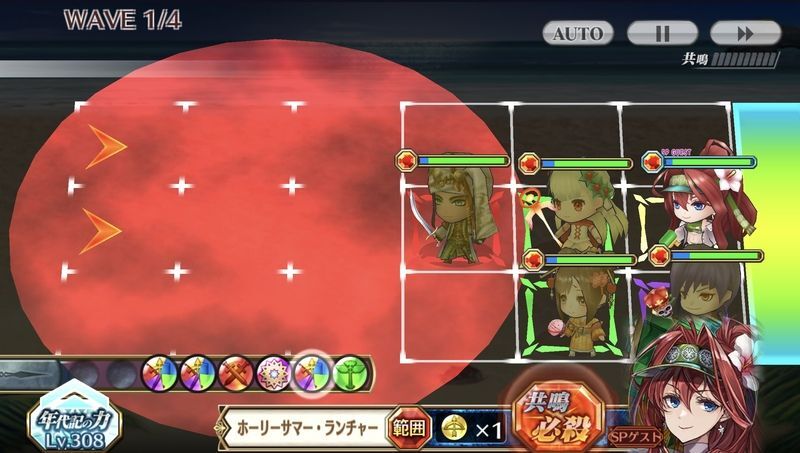 | ◆マナスロットのマナ数が多いほど味方全体の攻撃力(?%)と防御力(?%)と移動速度が上がる。効果はWAVE中続き、WAVEが進むたびに上書きされる。また地形が砂浜/船上/海中の時、マナスロット時にマナが2つ以上出やすくなる。 ◆戦闘開始時とWAVE開始時、地形を砂浜に一定時間(?秒)変更する必殺技が発動する。また地形が砂浜/船上/海中の時、WAVEが進むたび、全ての必殺技が使えるマナを1つ獲得する。 総員、海をナメないように! | |