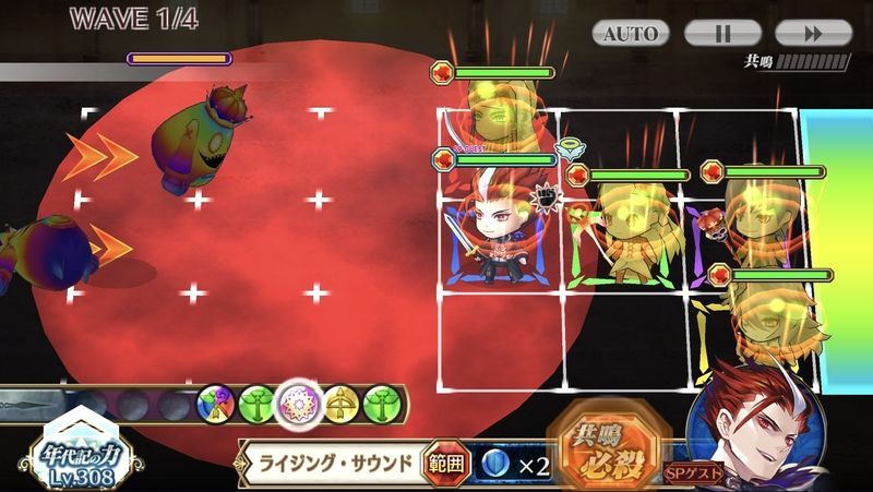 | 【超共鳴必殺/連撃】前方範囲内の全ての敵に5回ダメージ(?倍)を与え、転倒させる。その後、前方範囲内の全ての敵に大ダメージ(?倍)を与え、弾き飛ばし、ダウンにする。さらに味方全体の攻撃力(?%)と防御力(?%)と移動速度とクリティカル発生率とクリティカル威力(?%)が一定時間(?秒)上がる。また自身の攻撃速度が一定時間(?秒)上がる。この技は0マナで発動でき、発動時、万象マナを1つ獲得する。 | |||