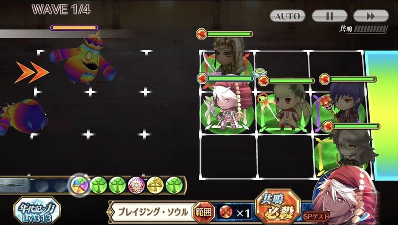 | 【共鳴必殺/連撃】味方全体の攻撃力(?%)と防御力(?%)と移動速度とクリティカル発生率とクリティカル威力(?%)が一定時間(?秒)上がる。その後、自身の攻撃速度が一定時間(?秒)上がる。さらにダッシュ範囲上にいる全ての敵に25回ダメージ(?倍)を与え、弾き飛ばした後、元の位置に戻る。 | |||