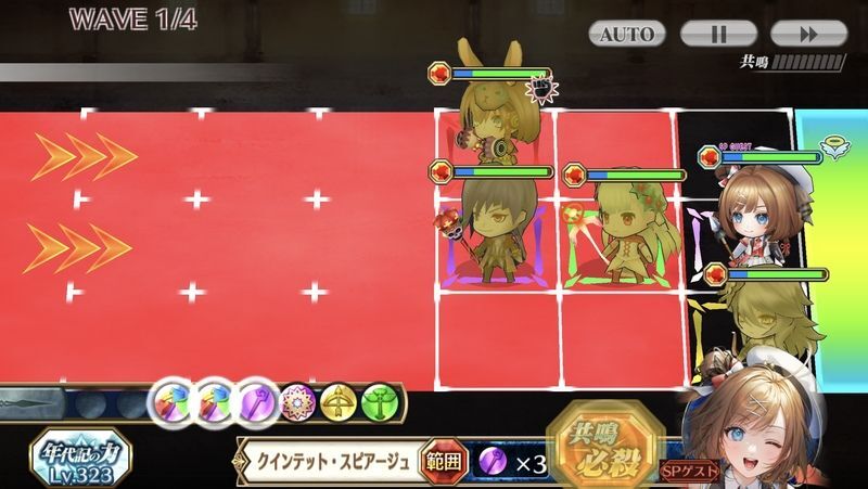 | ◆戦場にいる味方の攻撃力(?%)と防御力(?%)と移動速度が上がる。マナを獲得するたび、一定時間(?秒)効果が(?%)上がり、さらにHPが上限を(?%)超えて(?%)回復する。 ◆マナスロット時に万象マナが追加され、マナが2つ以上出やすくなる。またマナスロットのマナ数が多いほど味方全体の攻撃力(?%)とクリティカル発生率とクリティカル威力(?%)が上がる。自身の場合、効果が(?%)上がる。効果はWAVE中続き、WAVEが進むたびに上書きされる。 あたしもいつか、フィリアナ先生みたいに! | |