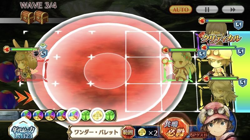 | ◆戦場にいる味方の攻撃力(?%)と防御力(?%)と移動速度が上がる。自身を含む味方が必殺技を発動するたび、一定時間(?秒)効果が(?%)上がる。自身が必殺技を発動した時、さらに効果が(?%)上がる。 ◆戦闘開始時とWAVE開始時、自身の攻撃速度が一定時間(?秒)上がり、前方範囲内の全ての敵に大ダメージ(?倍)を与え、ダウンにし、反響範囲を一定時間(?秒)作成し、反響範囲内の敵を攻撃した際、同範囲内の敵全てにダメージの一部(?%)を与え、ダウンにする必殺技が発動する。 ああ、今アタシは『冒険』をしてるんだ! | |