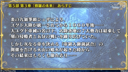 | ゲーム概要 | その冒険は世界の向こうへ!10周年を超え進化を続ける名作 3千万文字を超す圧倒的シナリオ1700体以上のキャラが織り成す王道スマホRPG チェインクロニクル |