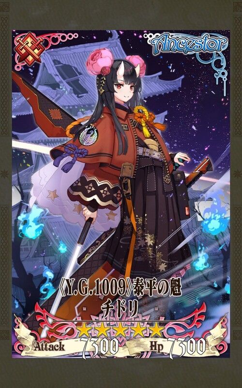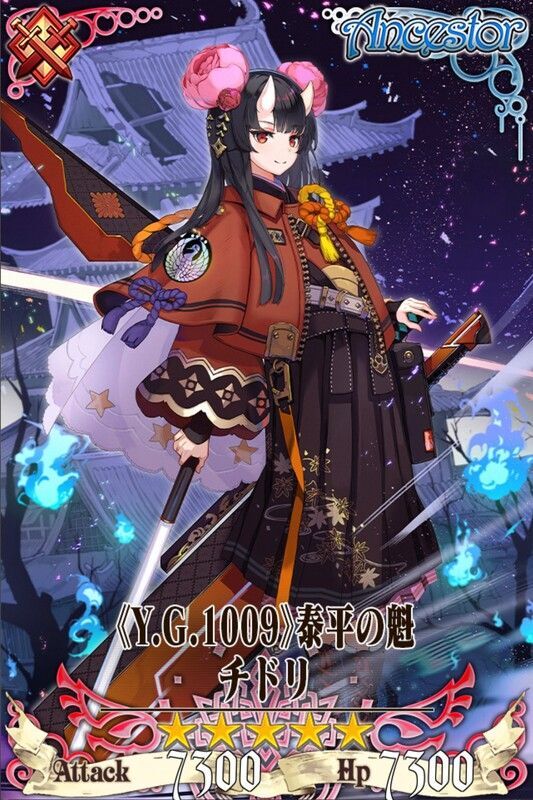 | ◆攻撃力(?%)が上がる。さらに攻撃を250回当てるたび、全ての必殺技が使えるマナを1つ獲得する。また戦闘開始時とWAVE開始時、軌道上の敵を自動で攻撃(?%)し、転倒させる折り鶴を2羽生成し、使用する度に数が増え、最大4羽まで生成する必殺技が発動する。 ◆必殺技の威力が(?%)上がり、全状態異常にならない。さらに攻撃時、攻撃した敵の攻撃力(?%)と防御力(?%)と移動速度が一定時間(?秒)下がる。またクリティカル攻撃時、クリティカル攻撃が6回になり、クリティカル威力(?%)が上がり、範囲攻撃になる。 《泰平の魁》として未来で活動する、鬼族の英雄。 | |