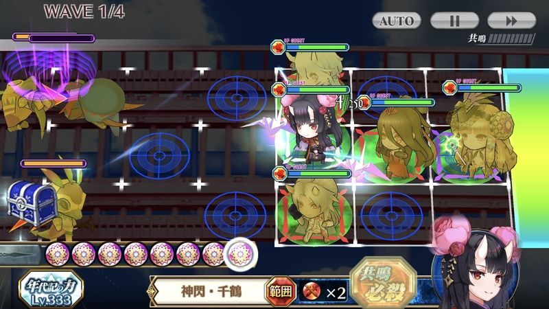 | 【連撃】味方全体の攻撃力(?%)と防御力(?%)と移動速度とクリティカル発生率とクリティカル威力(?%)が一定時間(?秒)上がる。その後、直線範囲上にいる全ての敵に一定間隔でダメージ(?倍)を与え、弾き飛ばす。発動中は移動と通常攻撃ができない。 | |||