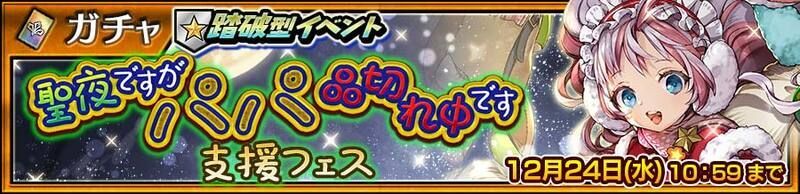 踏破型イベント「聖夜ですが、パパ品切れ中です」支援フェスでは、ガチャを一定回数引くと「聖夜の二ツ星の娘 クロテッド」をプレゼント!