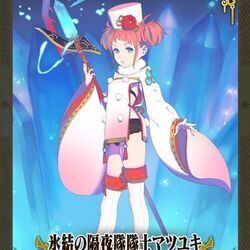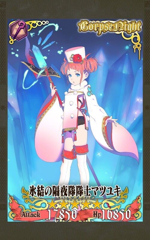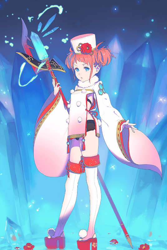 | ◆攻撃力(?%)とクリティカル発生率とクリティカル威力(?%)が上がる。また味方が必殺ボタンを使用して必殺技を発動すると、同じChain内で次に使用する必殺技の威力が(?%)上がる。この効果はサブパーティでも発動する。 ◆攻撃間隔が早くなり、通常攻撃が氷属性になる。さらに攻撃時、攻撃した敵に一定時間(?秒)、氷属性の弱点を付与し、属性防御力を(?%)下げる。また遠距離クリティカル攻撃 時、クリティカル攻撃が5回になり、範囲攻撃になる。 氷魔法を習得した隔夜隊の少女。 | |