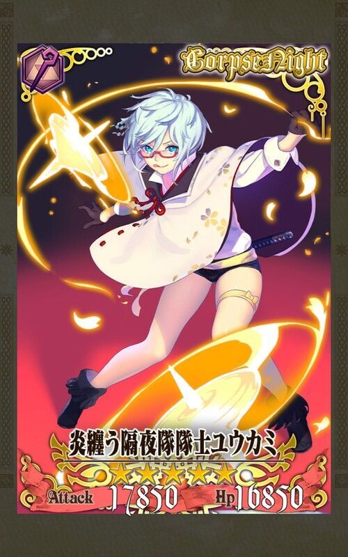 | ◆戦場にいる味方の攻撃力(?%)とクリティカル発生率とクリティカル威力(?%)が上がる。地形が夜の時、効果が(?%)上がる。自身の場合、さらに攻撃間隔が早くなる。 ◆戦闘開始時とWAVE開始時、地形を夜の街中に一定時間(?秒)変更し、前方範囲内の全ての敵に炎属性のダメージ(?倍)を与え、炎属性の反響範囲を一定時間(?秒)作成し、反響範囲内の敵を攻撃した際、同範囲内の敵全てにダメージの一部(?%)を与える必殺技が発動する。 炎の霊気よ、熱波の壁となれ! | |