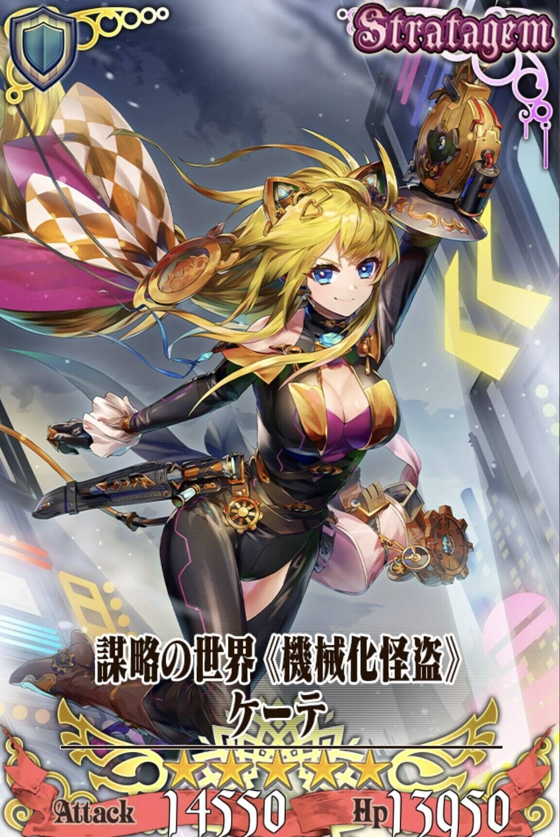 | 謀略のカ《機械化怪盗》 | ◆全ての必殺技が使えるマナを1つ持った状態で戦闘を開始する。◆攻撃力(?%)とクリティカル発生率とクリティカル威力(100%)が上がる。自身より後ろに味方がいると効果が(攻撃力45%、クリティカル威力100%)上がり、さらに防御力(?%)と移動速度が上がり、HPが徐々に(10%/2.5秒)回復する。◆攻撃間隔が早くなる。またクリティカル攻撃時、クリティカル攻撃が2回になり、範囲攻撃になり、与えたダメージ量に応じて、自身のHPが(?%)回復し、一定確率でダウンにする。《機械化怪盗》として活動する、鉄煙の戦士。 |