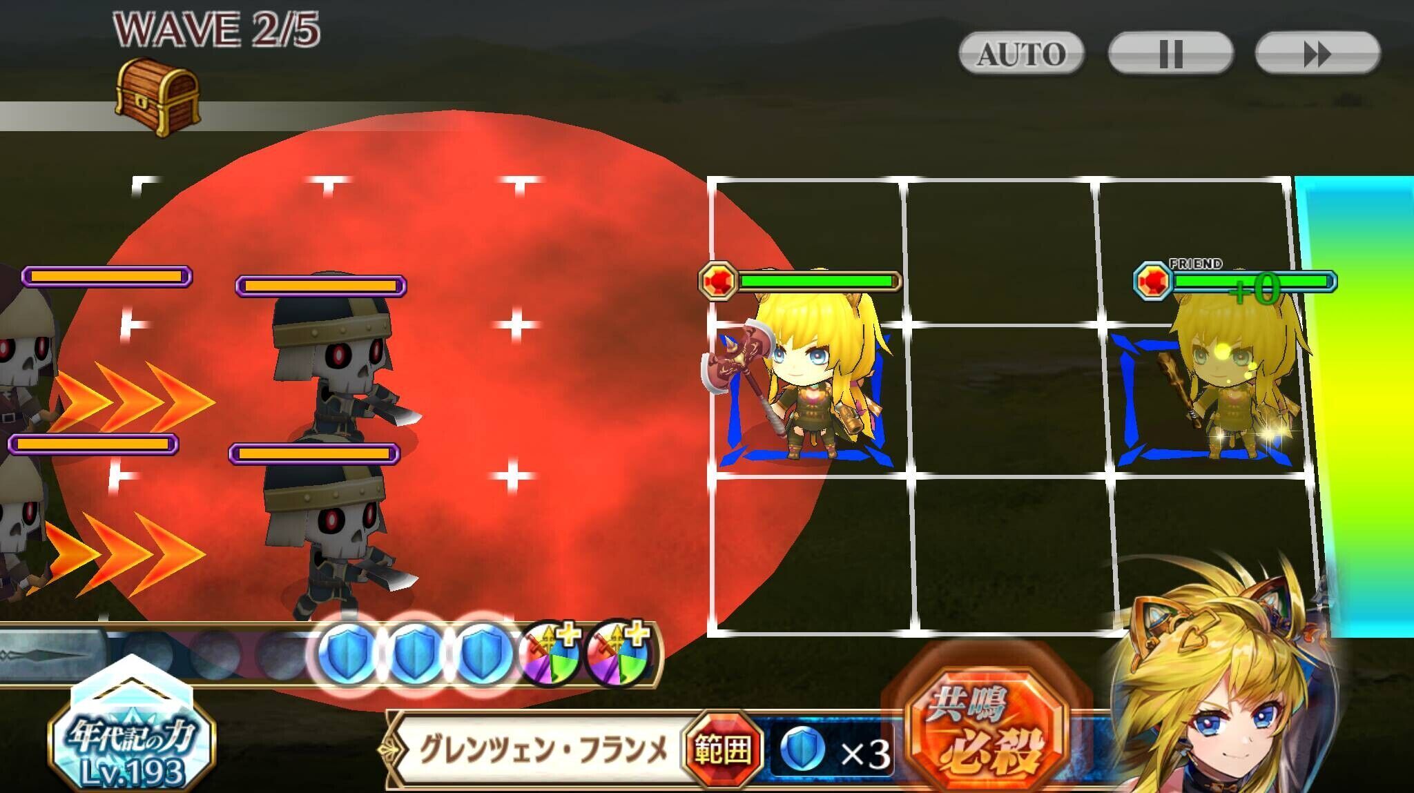 | グレンツェン・フランメ | 3 | 【共鳴必殺/連撃】前方範囲内の全ての敵に4回ダメージ(1回/?倍)を与え、転倒させる。その後、前方範囲内の全ての敵に大ダメージ(?倍)を与え、弾き飛ばし、ダウンにする。さらに味方全体の攻撃力(?%)と防御力(?%)が一定時間(?秒)上がる。 |