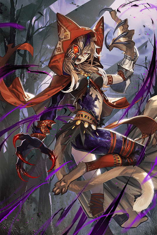 | ◆全ての必殺技が使えるマナを1つ持った状態で戦闘を開始する。 ◆攻撃力(?%)と防御力(?%)と移動速度が上がる。自身より後ろに味方がいると効果が(?%)上がり、さらにクリティカル発生率とクリティカル威力(?%)が上がる。 ◆敵に必殺技で攻撃するたび、攻撃力(?%)が一定時間(?秒)上がる。またクリティカル攻撃時、クリティカル攻撃が4回になり、クリティカル威力が(?%)上がり、範囲攻撃になり、与えたダメージ量に応じて、自身のHPが上限を(?%)超えて(?%)回復する。 《闇に吼える者》として境界騎士団と共闘する、猫爪族の闘士。 | |