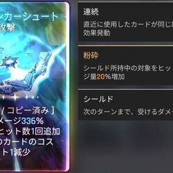 | 2凸 | おすすめ度:★★★ アンカーシュートカードが、コストが不足していても使用可能になります。 この効果で使用したアンカーシュートカードは残りのアクションポイントを全て消費し、元のコストより少ないアクションポイントで使用された場合、不足分1ごとに、ダメージ量が40%減少します。 |
